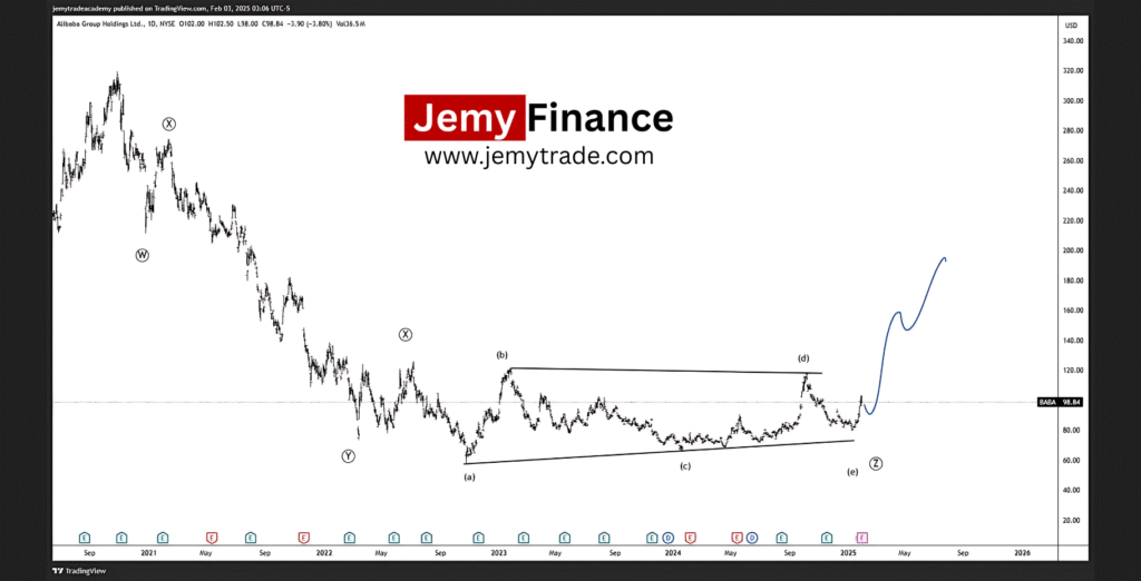 In the period leading up to the recent rally, Alibaba’s stock was trading within a wide price range, puzzling many analysts and investors. However, our advanced technical analysis, based on wave theory, revealed that the stock was undergoing a highly complex multi-leg corrective phase. This correction was identified as a triple corrective pattern (W-X-Y-Z), a rare pattern indicating that the market is experiencing uncertainty before taking on a new direction.