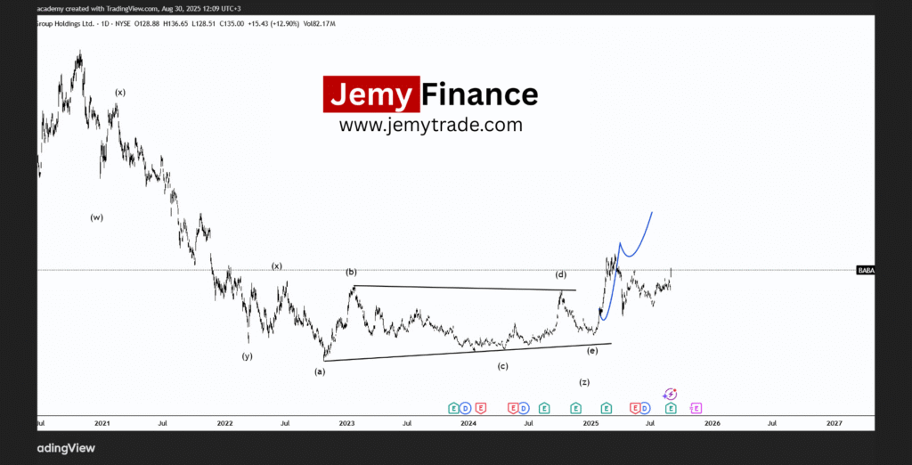 The subsequent chart confirms that our vision was accurate. As soon as the descending triangle pattern, marking the end of wave (Z), was completed, Alibaba stock began its upward journey exactly as we predicted. The movement was strong and sustained, reflecting the underlying power that had built up within the corrective pattern.