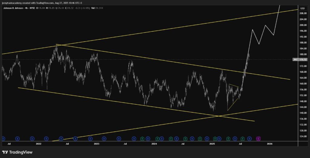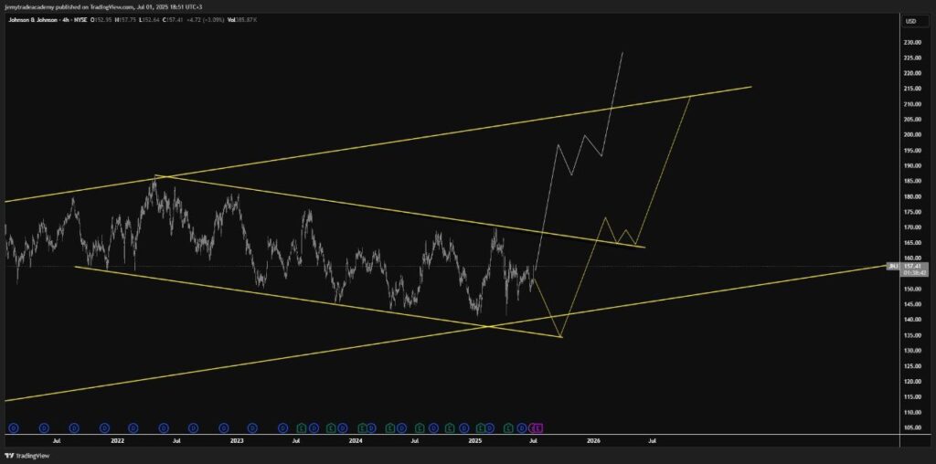 In the complex ecosystem of pharmaceutical and consumer health markets, identifying companies poised for sustained growth requires a nuanced understanding of both underlying fundamentals and technical market patterns. Today, the Jemy Finance team proudly presents a retrospective look at our analysis of Johnson & Johnson (JNJ) from earlier this year, an analysis that accurately forecasted a significant upward trajectory for the stock. This success underscores our integrated approach, combining deep sector knowledge with precise technical charting.