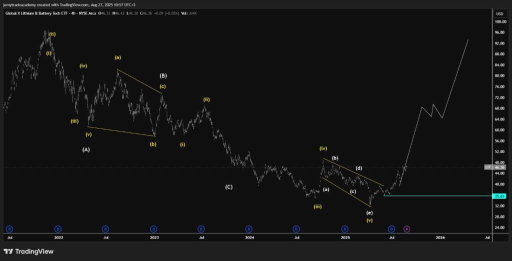 While the fundamentals built a compelling long-term case, our technical analysis provided the crucial roadmap for understanding the price action. Employing advanced Elliott Wave principles, our team meticulously identified the prolonged downtrend in the LIT ETF as a complex corrective pattern, specifically a long-term expanded flat. This intricate pattern, characterized by three primary waves (A, B, and C), was nearing its completion, signaling an imminent reversal.
