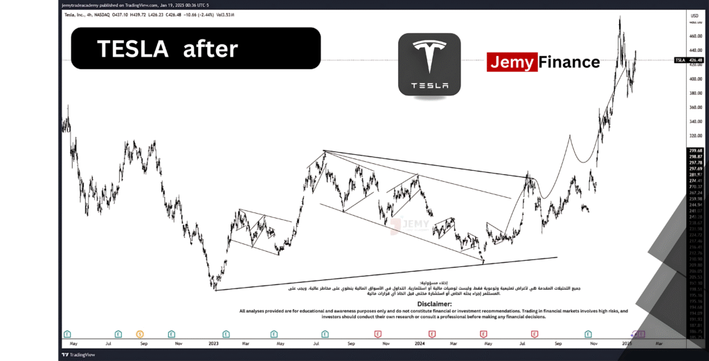 As shown in our “Before” analysis, the converging trendlines of the symmetrical triangle were a clear indicator that Tesla stock was compressing energy, preparing for a significant breakout. Our projections indicated that once the upper boundary of this triangle was breached, a new impulsive wave to the upside would commence, driving prices significantly higher. This meticulous charting allowed us to anticipate the turning point with remarkable accuracy.